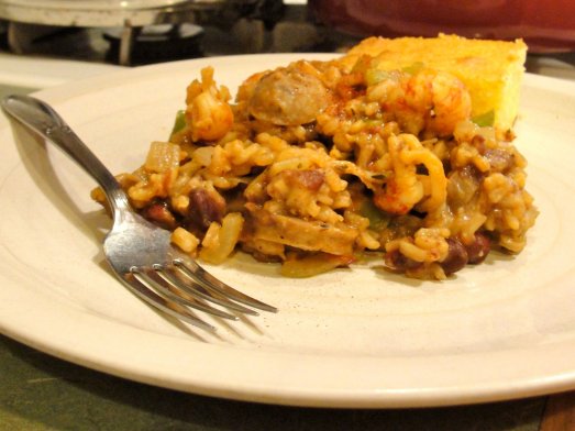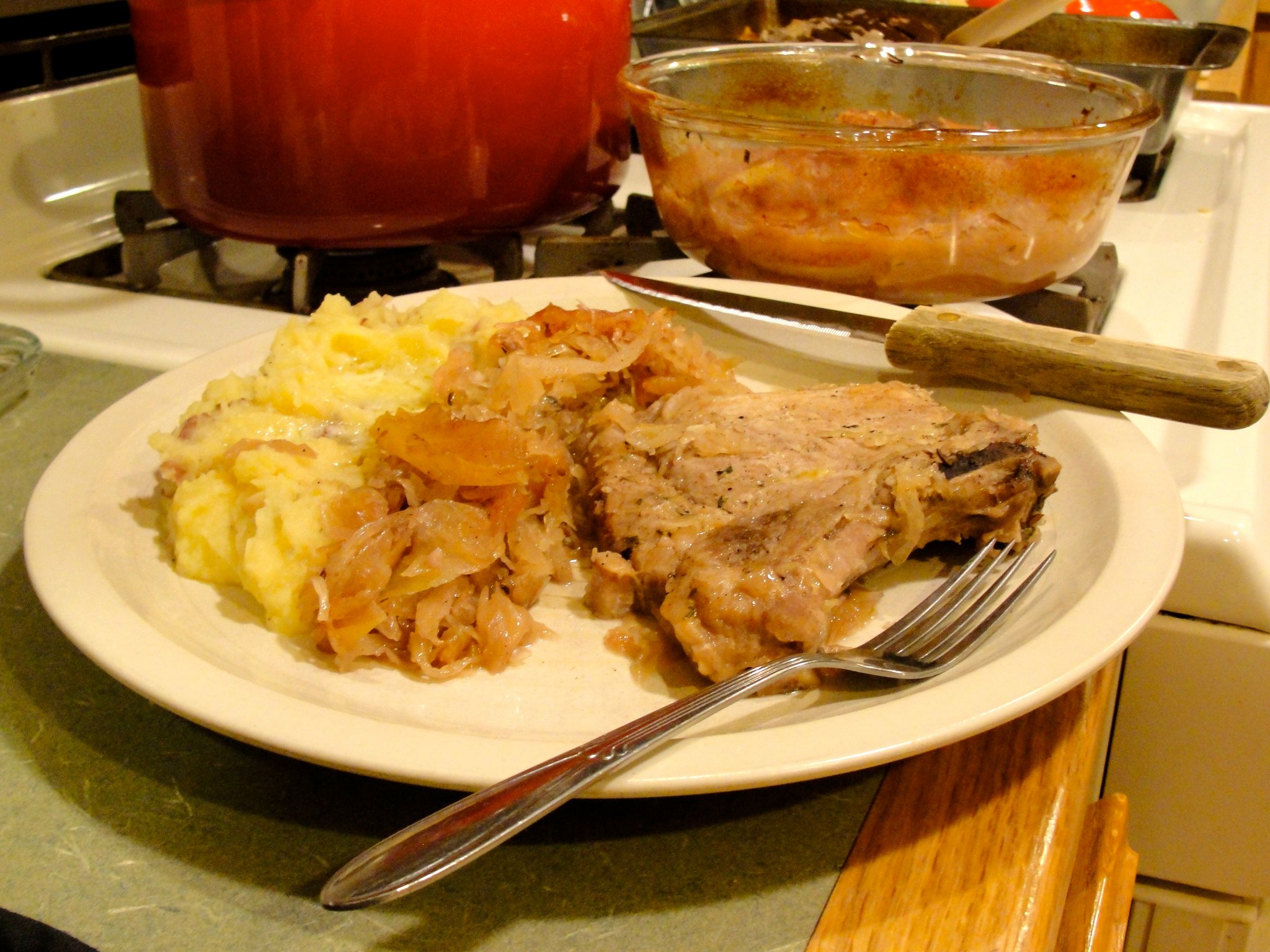 Select end or center cut pork chops with bone (e.g., one chop per serving, 1/2″-3/4″ thick), brown chops lightly in a frying pan on medium-high heat and place them in a single layer in a baking dish then season them with salt, pepper, thyme, oregano. In the frying pan, lightly sauté sauerkraut combined with thin slices of apple (I used 2 cans of Frank’s brand sweet sauerkraut with caraway seed and 1 Braeburn apple for 5 chops); season kraut with some ground cinnamon, allspice, a tablespoon or two of brown sugar, and minced cloves of garlic while sautéing. In the baking dish, cover the chops completely with kraut and apple mixture and ensure that there is enough moisture in the dish. (The liquid from canned sauerkraut was sufficient; otherwise add water or balanced lager beer so that there is at least 1/4″ of liquid in the pan.) Cover the dish and bake for one hour at 300°F. Uncover and splash a few ounces of red wine over the top, then continue to bake, uncovered, for another half hour or more at 325°F; occasionally spoon liquid over top as necessary to keep moist. Serve with garlic mashed red potatoes as a side.