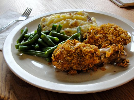 Oven-fried Chicken with Garlic Mashed Red Potatoes and Green Beans