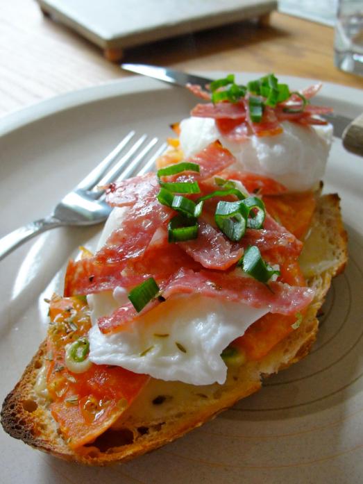 Sourdough topped with sliced Parmesan Reggiano, sliced heirloom tomato, oregano, sliced scallion. Toasted in toaster oven, along with slices of dry salami sliced into strips, to brown slightly. Once toasted, topped with poached egg, salami strips and scallion greens.