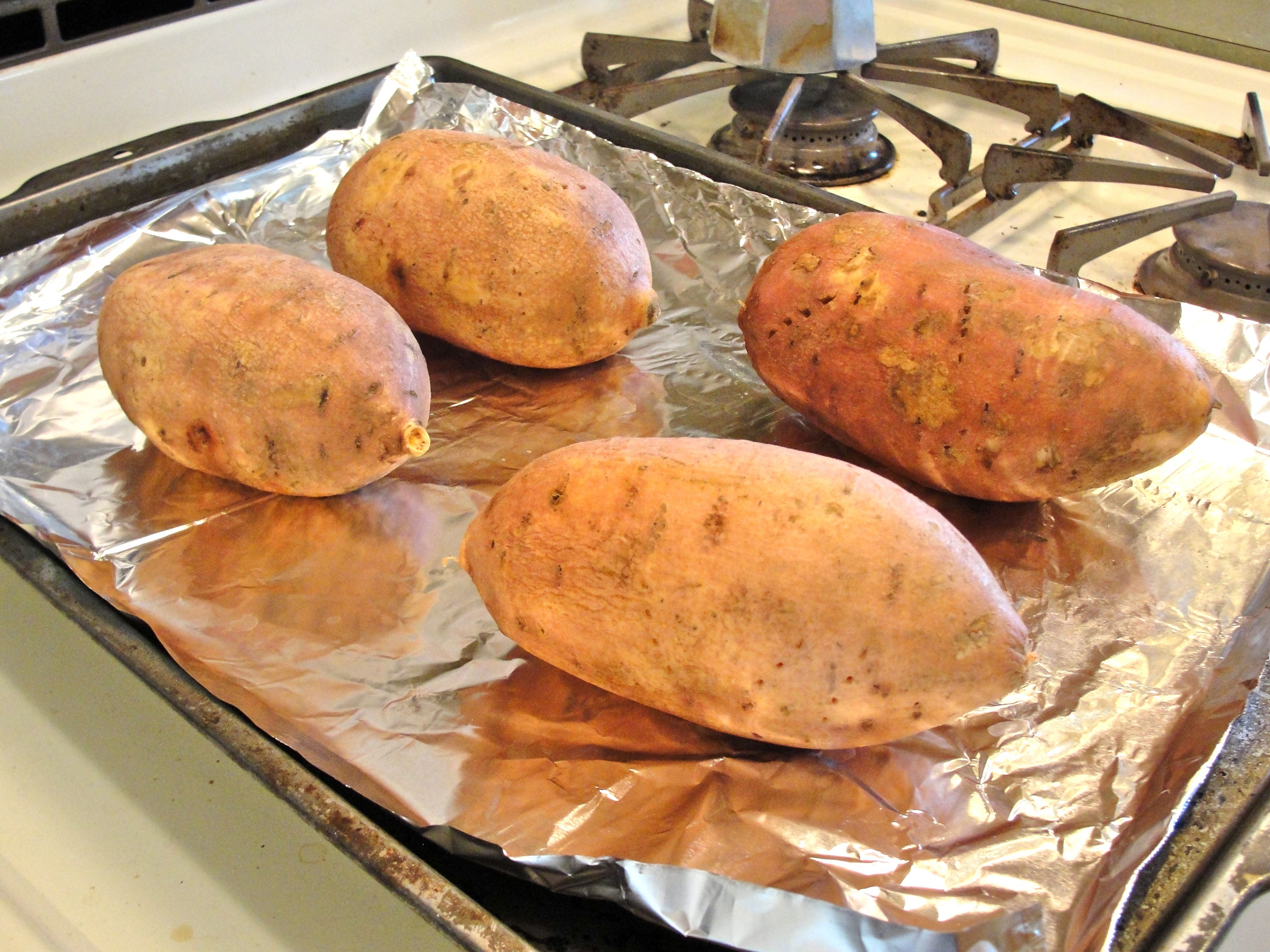 To prepare for baking, poke holes in the potatoes with a fork and place them on a foil on baking sheet or jelly roll pan; the foil will prevent burning and mess from the sugary syrup that may drip from them while baking.