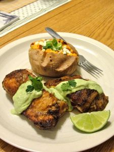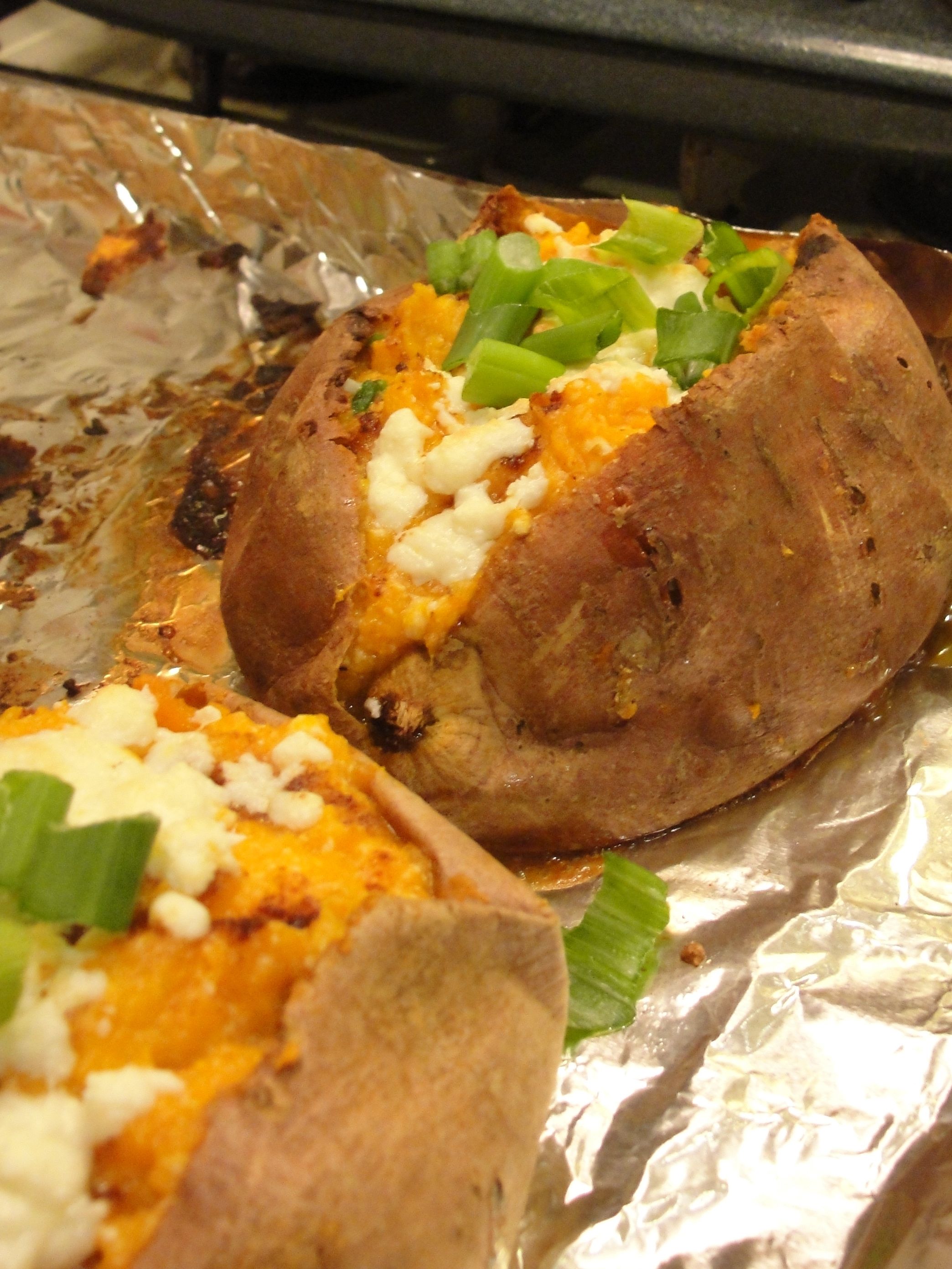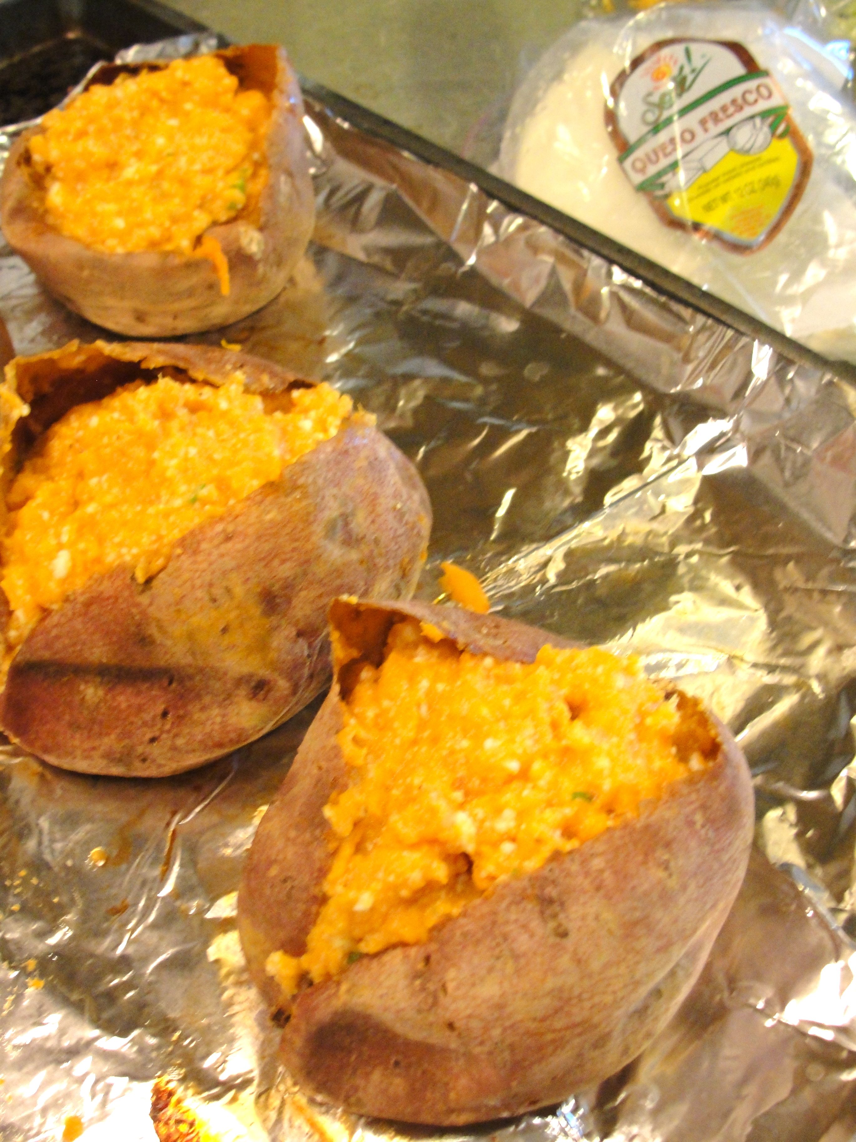 Here’s a similar recipe that I used as a reference (I prefer using queso fresco or feta rather than cream cheese): Stuffed Sweet Potatoes