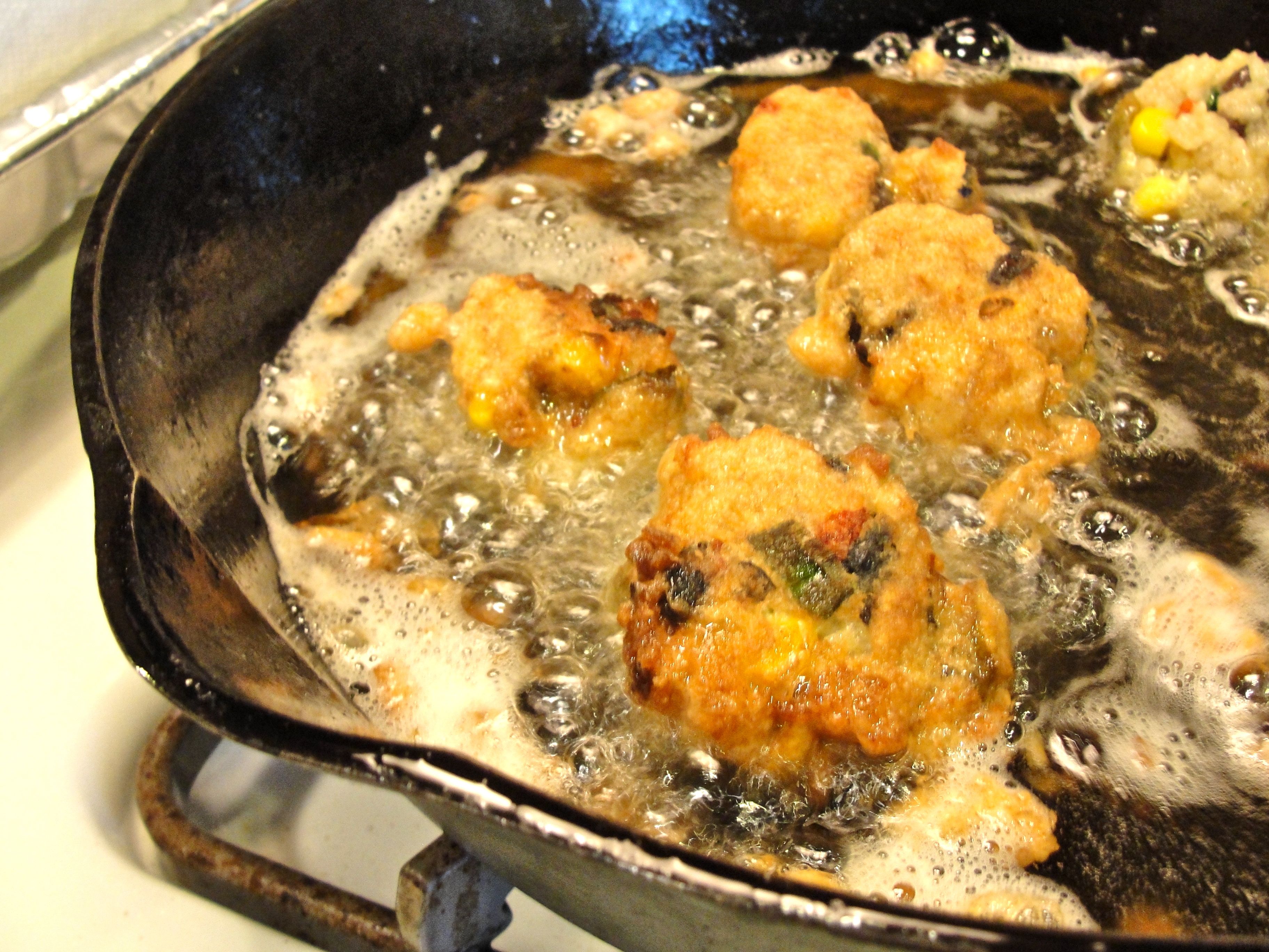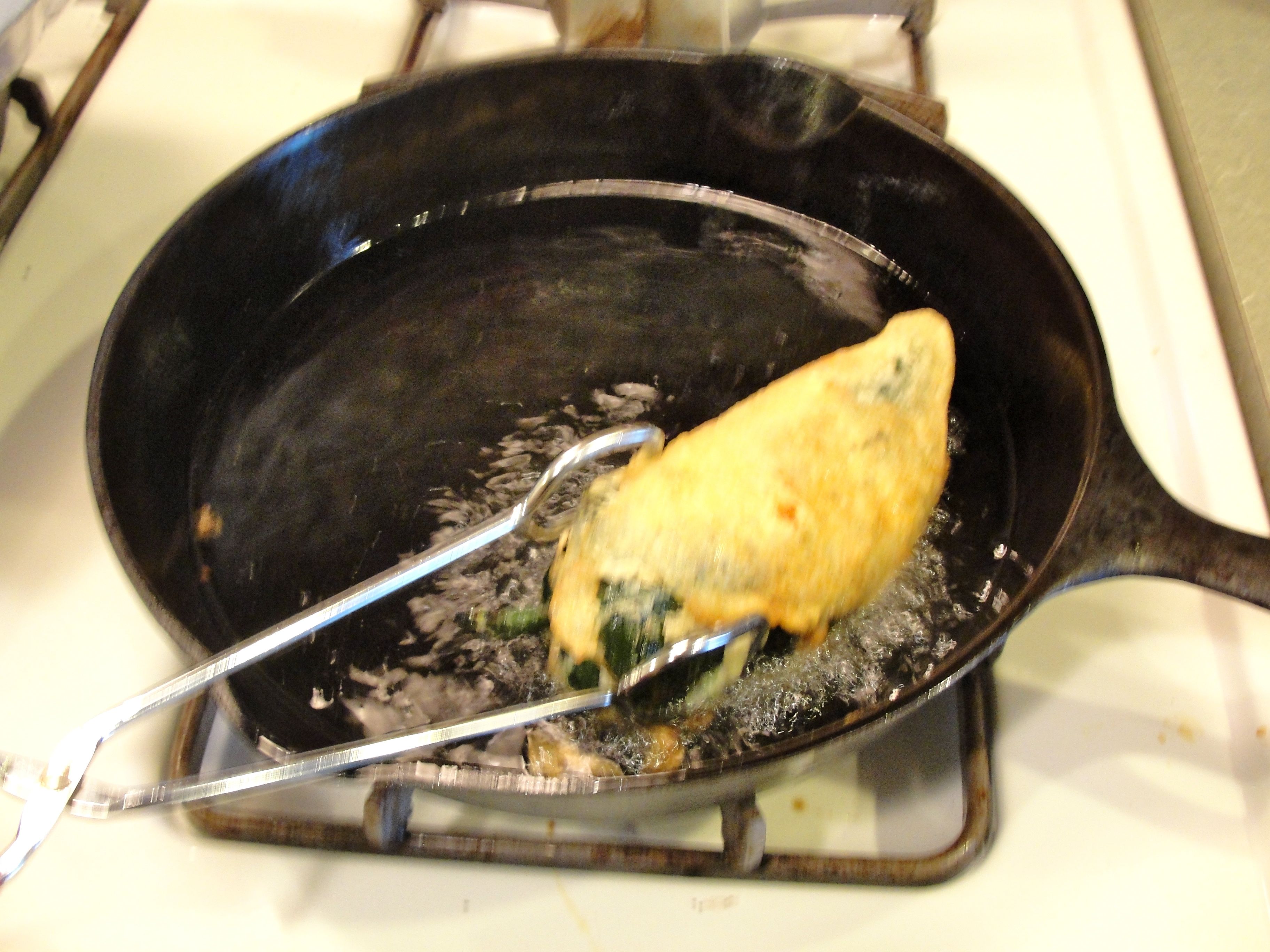 Then dip them in the egg batter, and place them in hot oil, e.g., about 1/2 inch deep; I tested the oil temperature by frying some corn tortilla strips. Be sure to adjust the temperature so that it sizzles when something is dipped in, but doesn’t cook so fast that it will quickly burn.