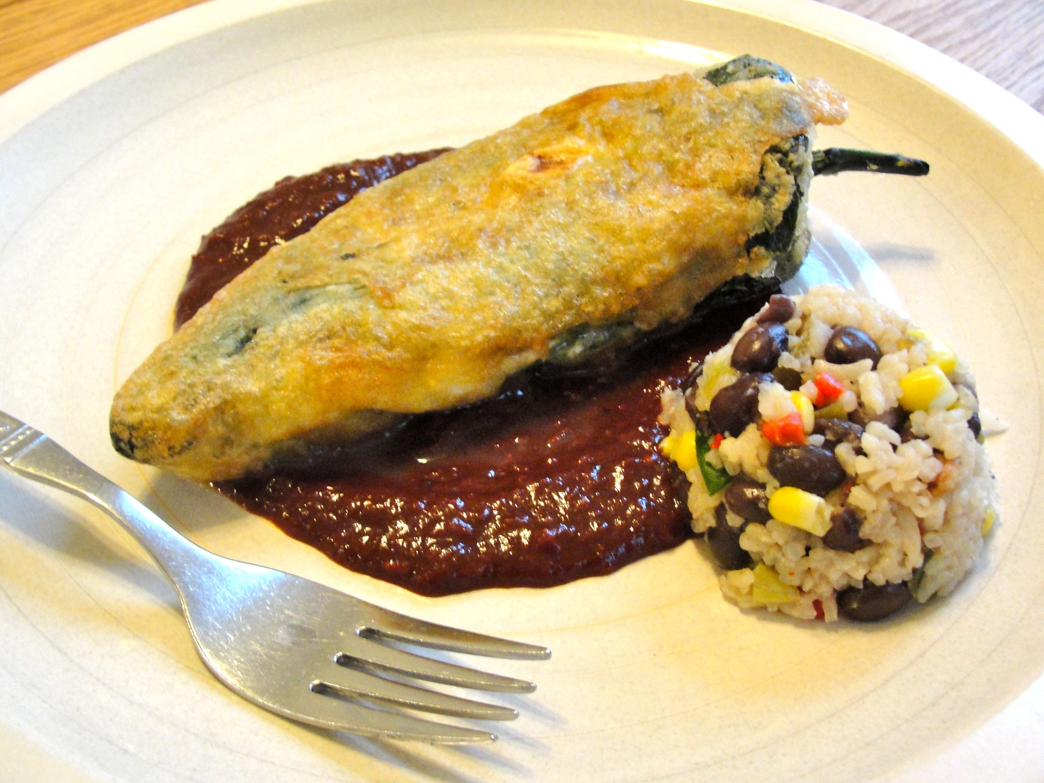 Chile Relleno de Queso with Ancho Chile Sauce and Scotch Bonnet Beans and Rice |