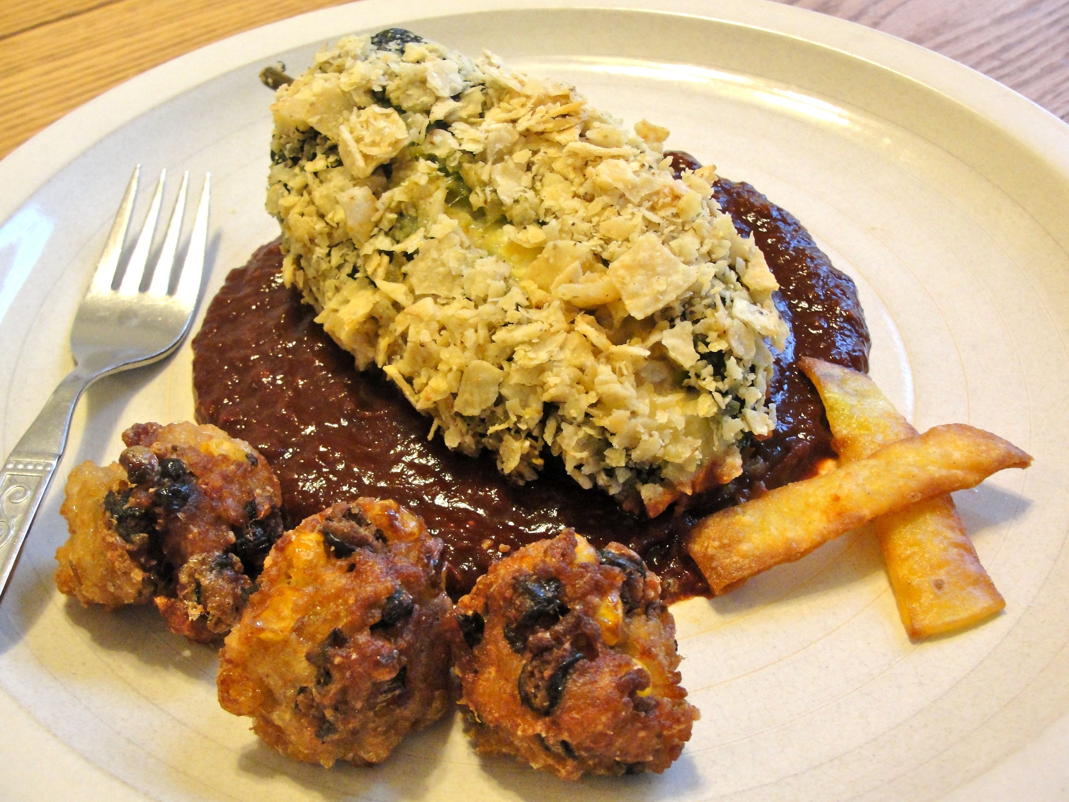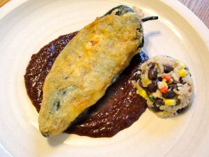 Baked Chile Relleno stuffed with Queso Fresco, Beans and Rice, atop Ancho Chile Sauce, accompanied by Rice Fritters |