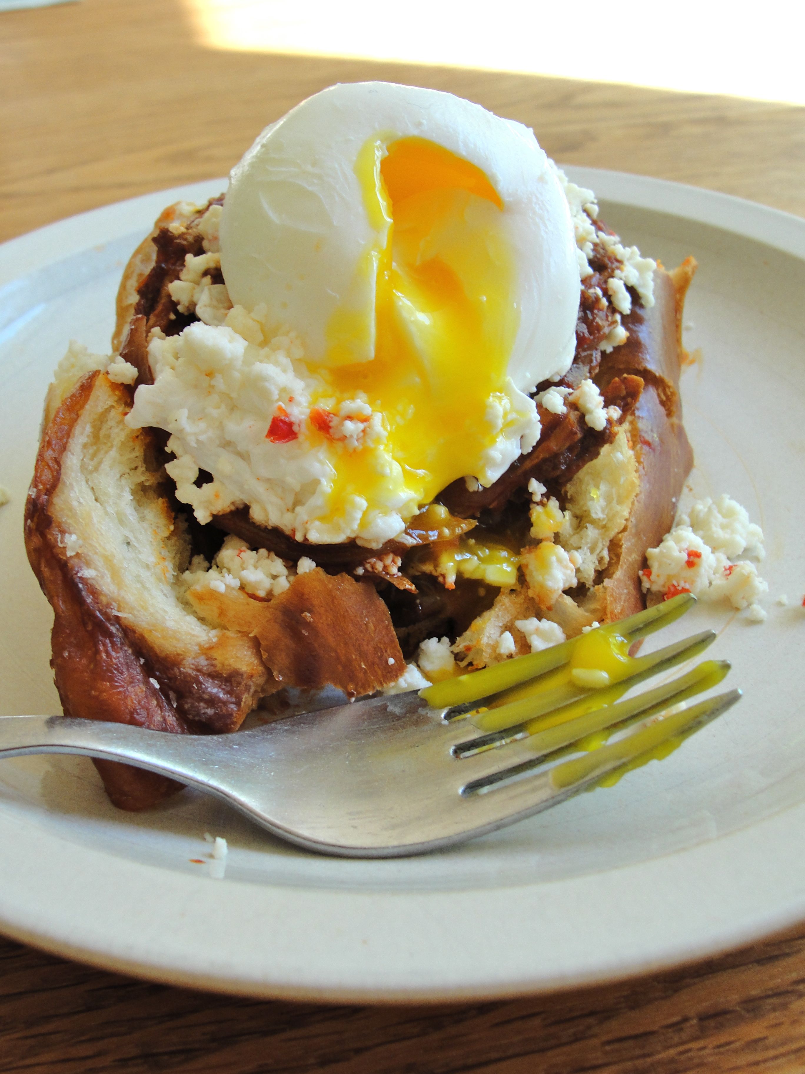 Chicken Tinga with poached egg and queso fresco on spiced bread.