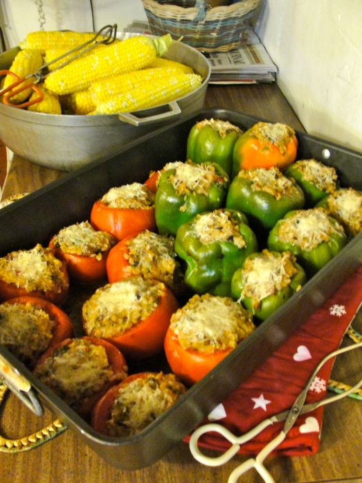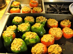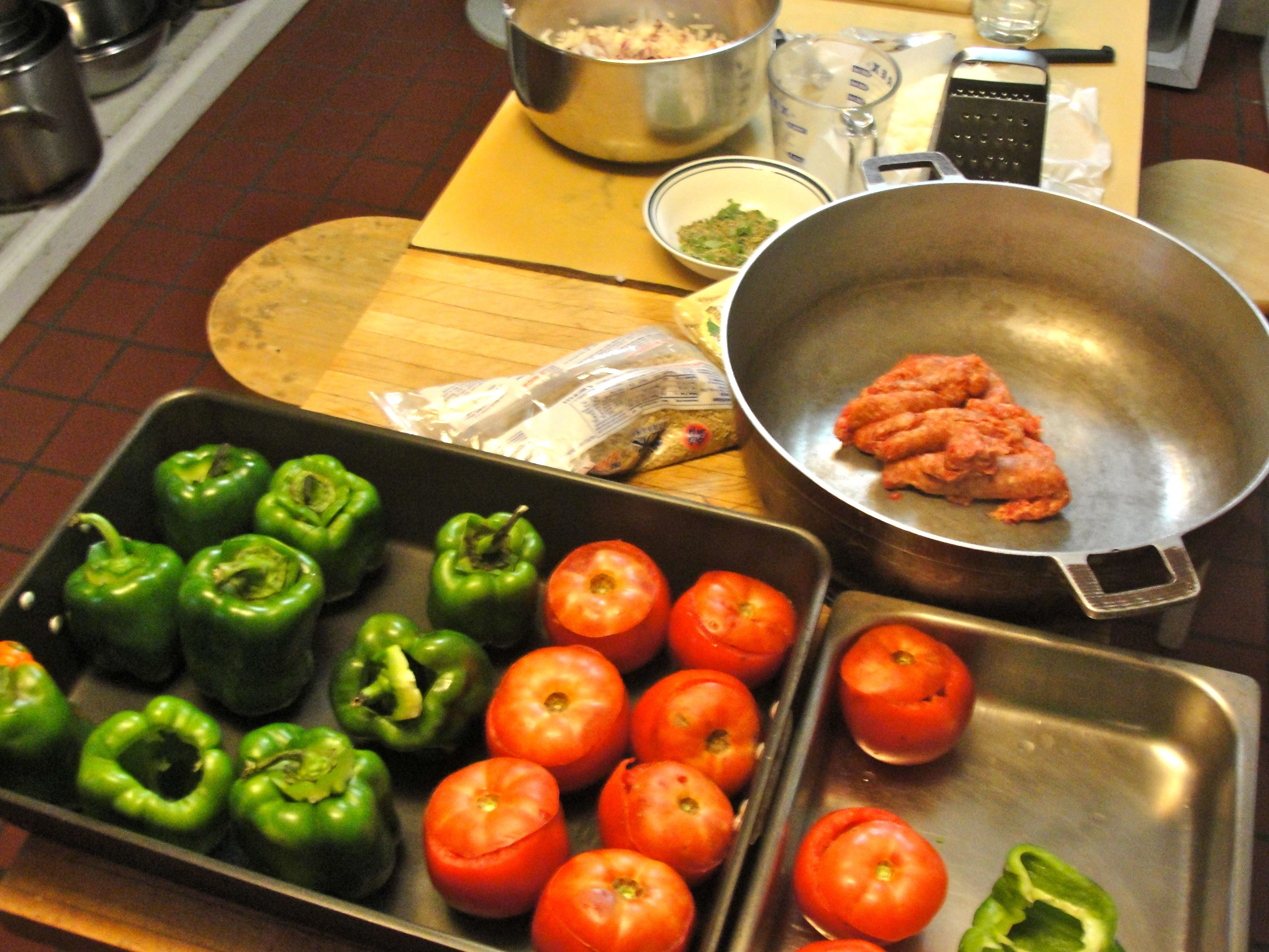Once the filling was mixed together with the cooked brown rice and seasoned to taste, the peppers and tomatoes were filled. We also made some vegetarian only filling, substituting some more cheese instead of the sausage, and we were careful to keep track of which were the vegetarian ones.