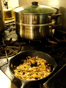 Humongous steamers are great for preparing the vegetables, and the range top with so many gas burners allows many things to be going at once.