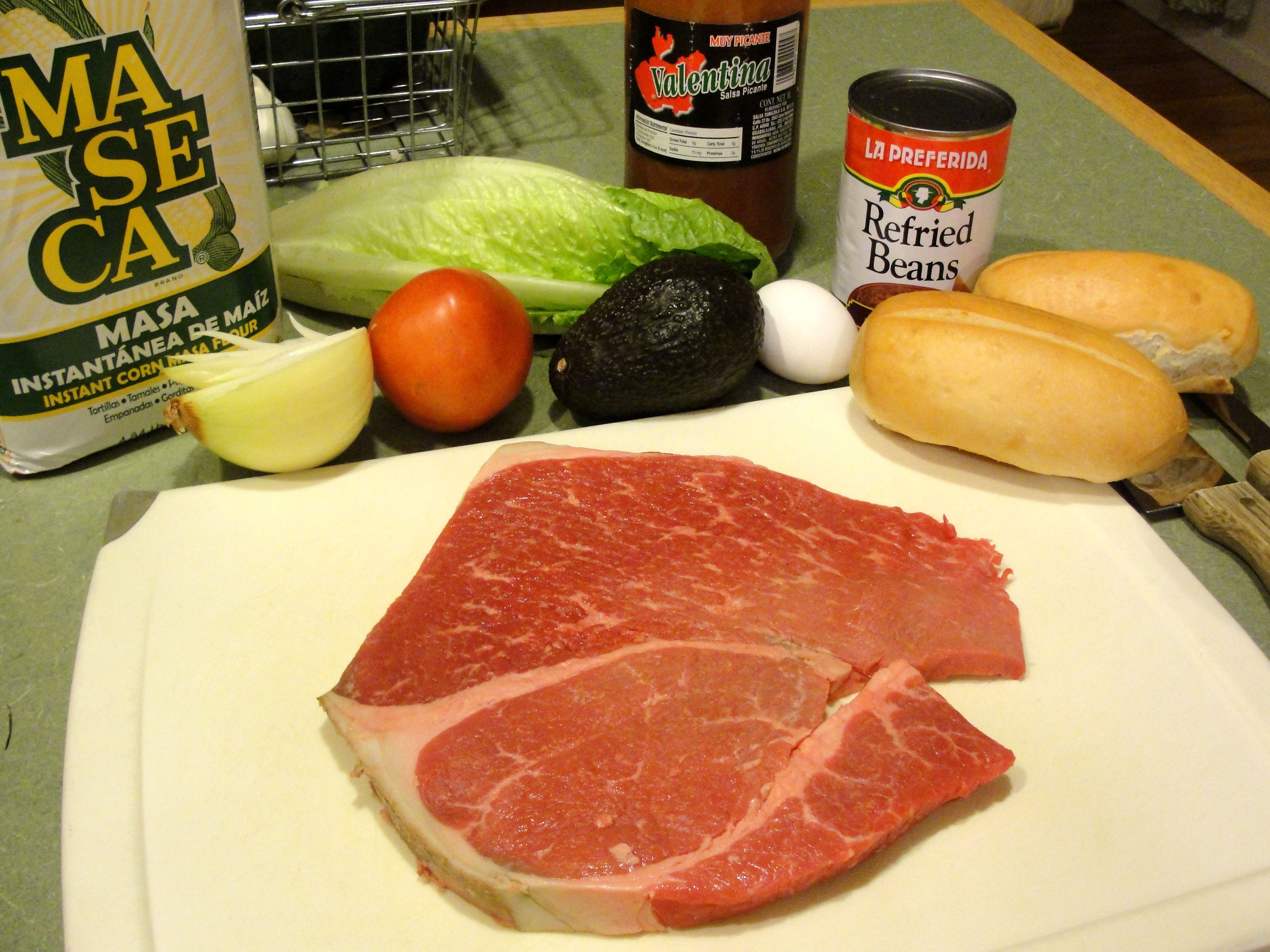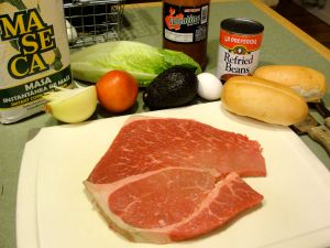 To assemble the sandwich, slice the roll, e.g. a club roll, and consider removing some of the bready inside (to make room for ingredients, while making the sandwich still able to be easily managed in hand). Then smear the roll with refriend beans, add the breaded steak, sliced raw onion, sliced tomato, chopped lettuce, avocado slices, and hot sauce.