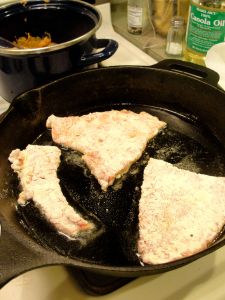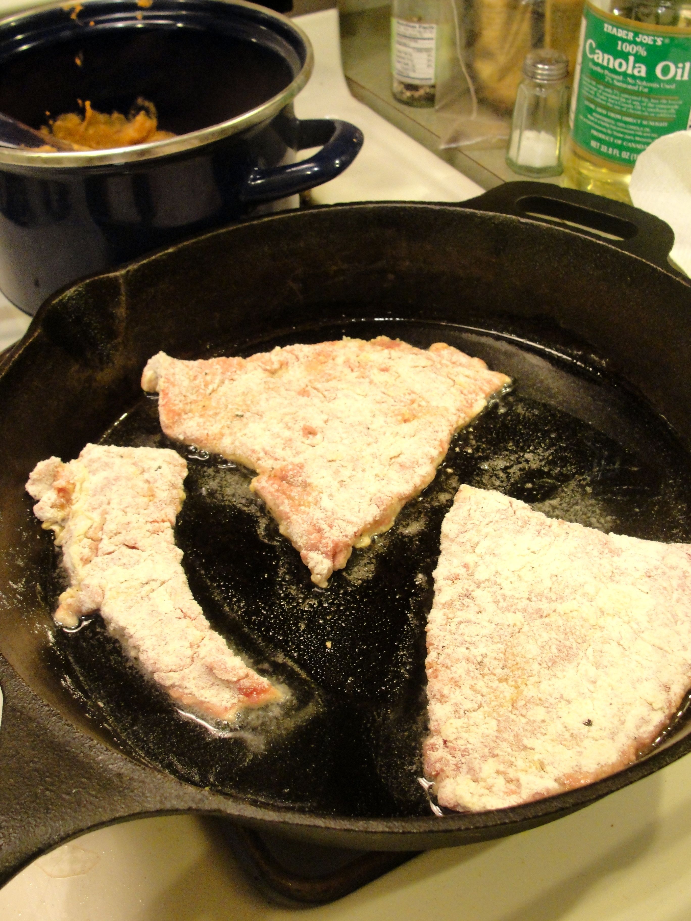Trim the steak and pound the steak pieces to tenderize and flatten to about 1/4″ thick. Dip them in egg wash, and then in flour that is spiced generously with salt and pepper.