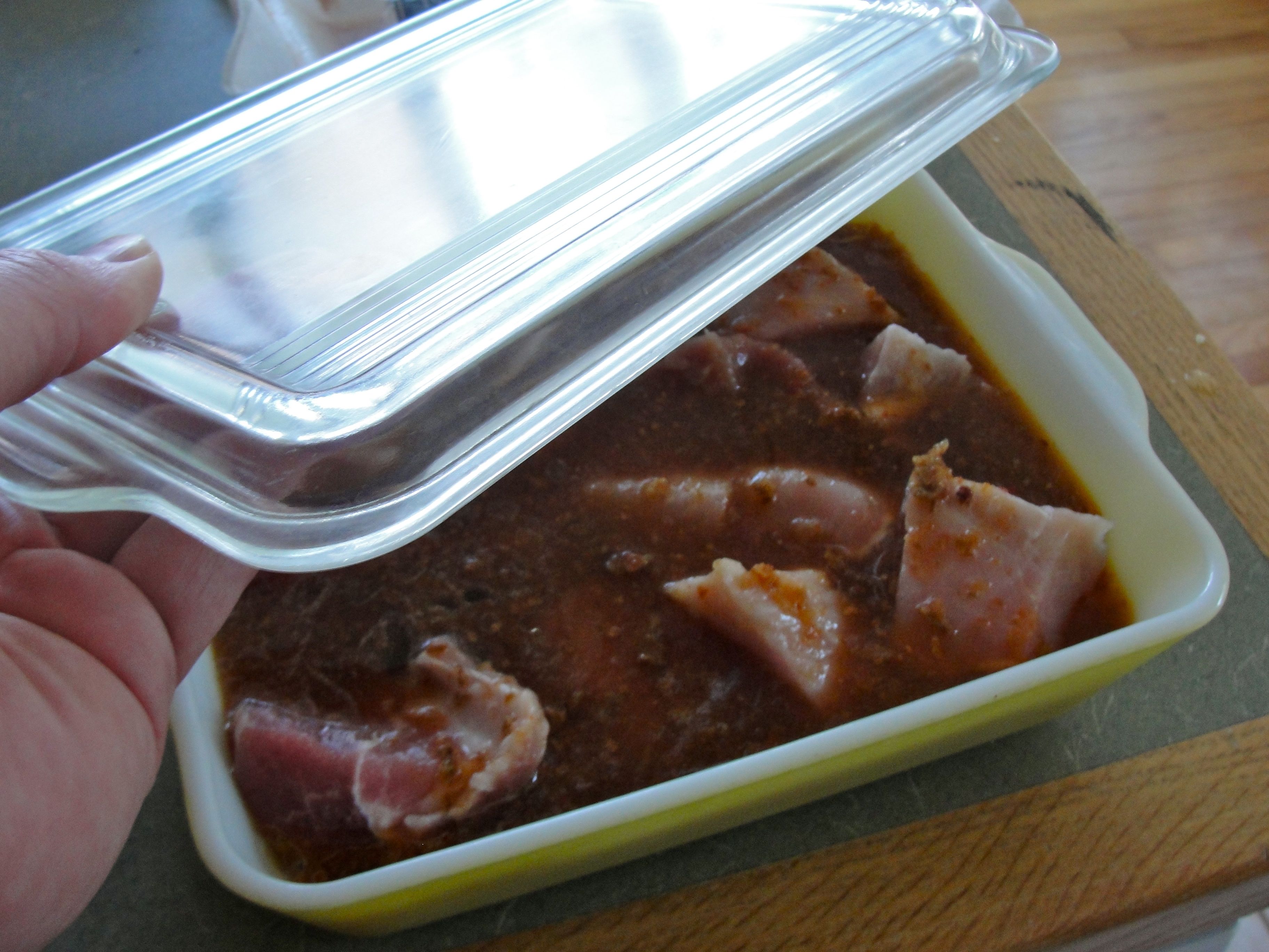 Next, I cut the pork into approximately 2″ cubes and placed them in a baking dish. Because the rib end roast was quite lean, I added the warm rendered pork fat (~1/3 cup) from cooking 1 pound of low-sodium bacon (left from yesterday’s breakfast).