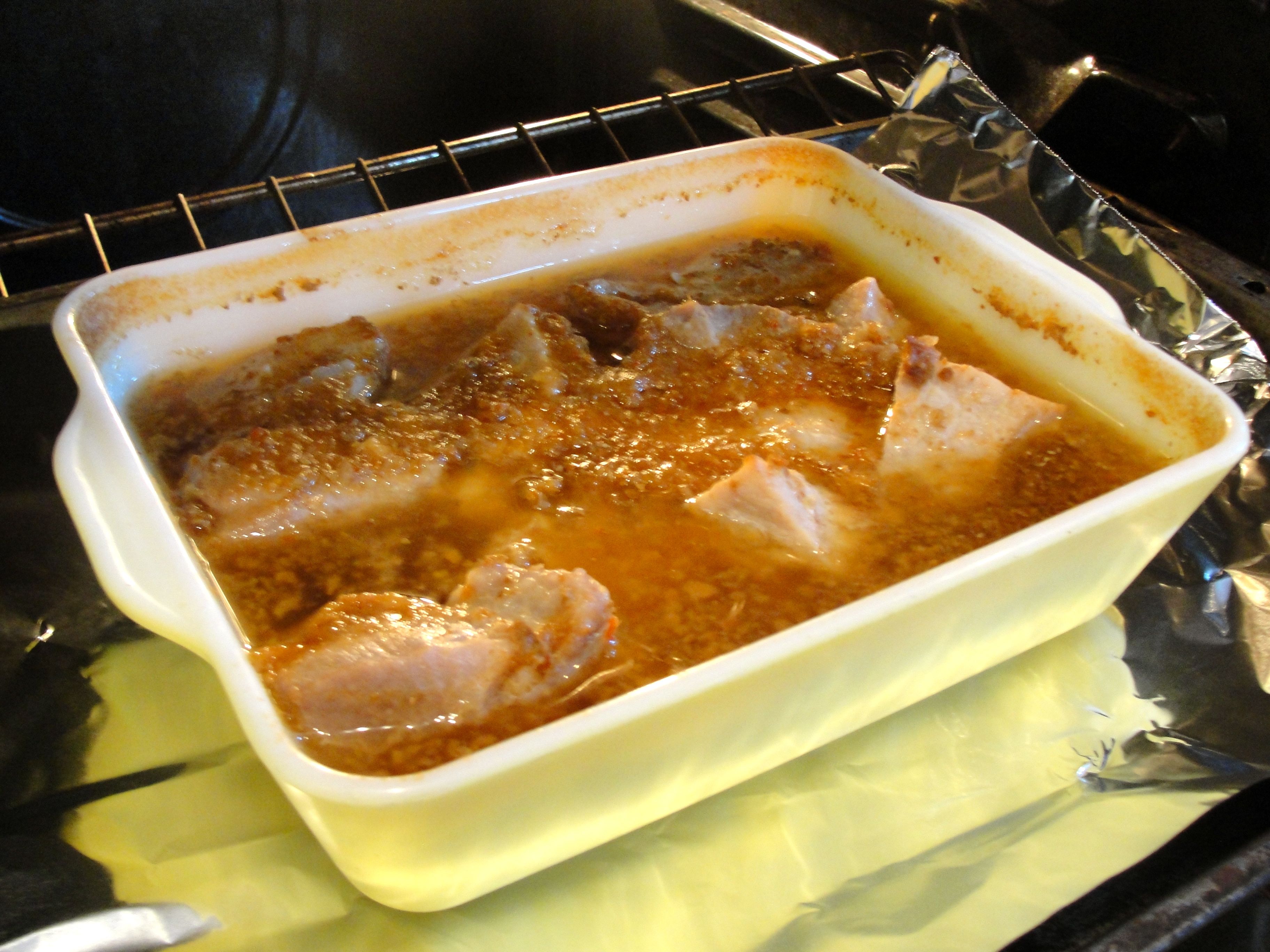 I poured the chipotle and water mixture over the pork, covered the dish, and put in a preheated 375° F oven for 1 hour.