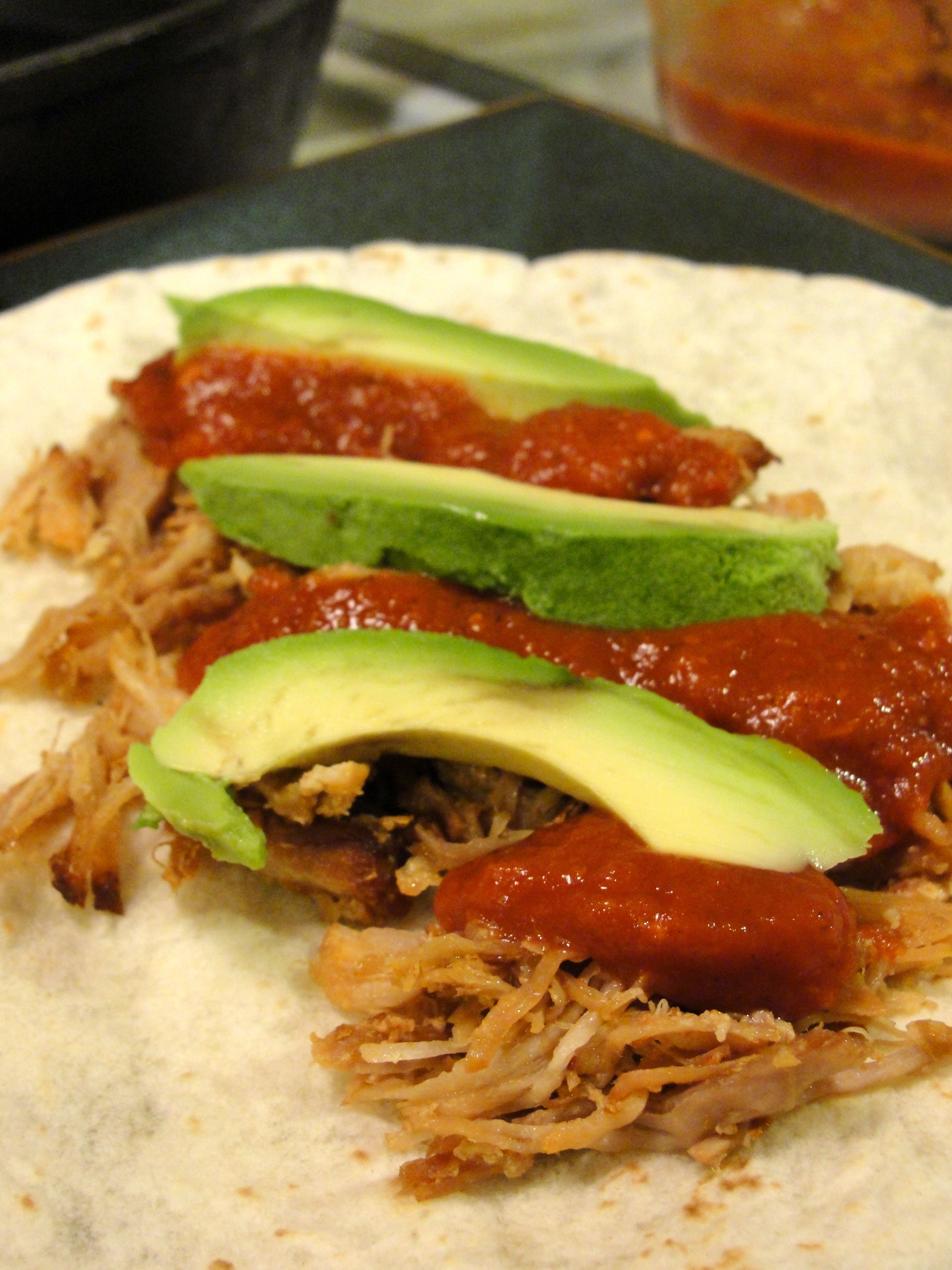 I served the carnitas in tacos, on warmed tortillas, topped with a homemade chipotle garlic salsa and slices of fresh, ripe avocado.
