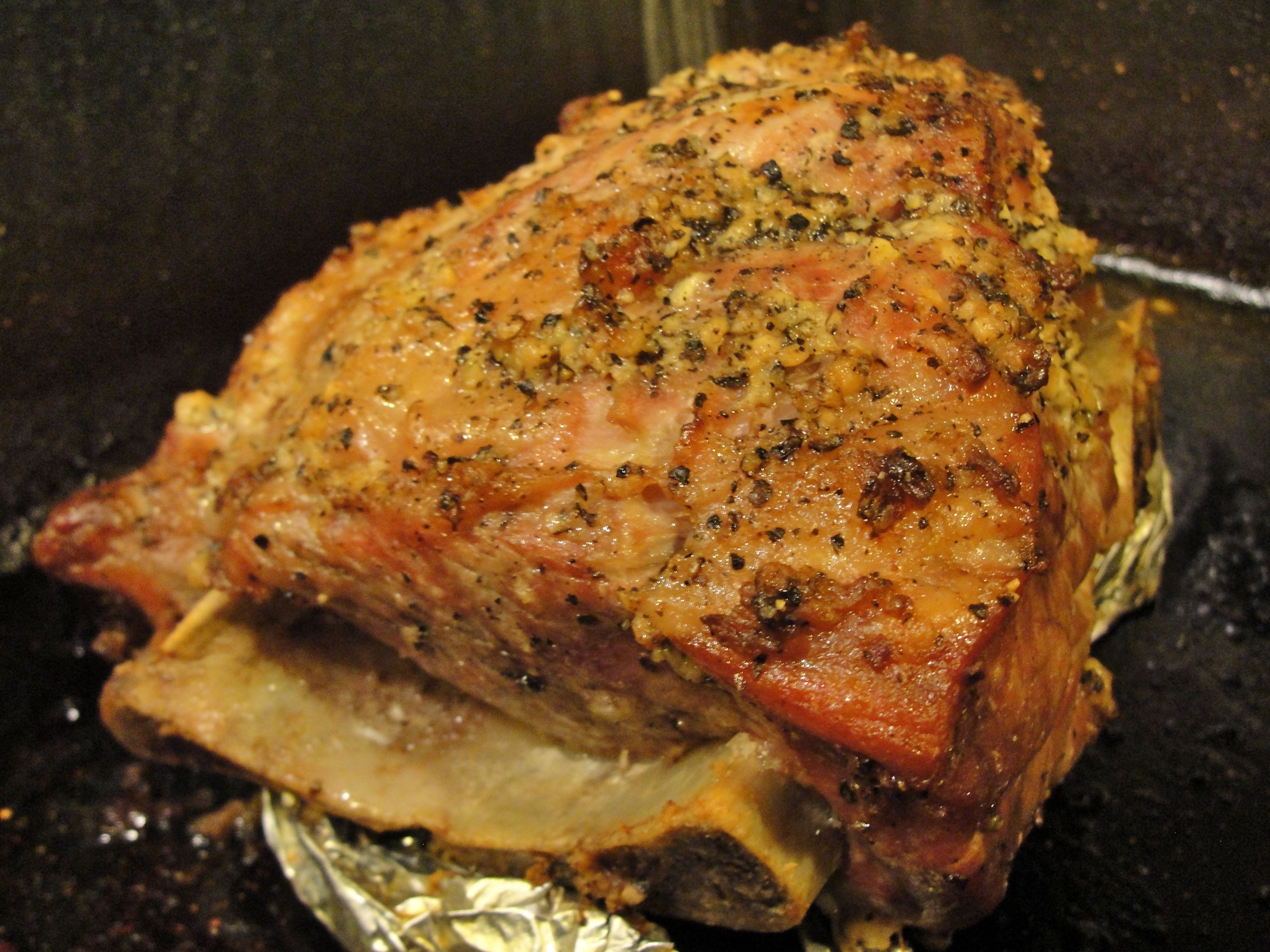 This is a really simple recipe; season the pork shoulder with just olive oil (~4 T.), fresh ground pepper (~1 T.), coarse salt (~1 1/2 t.), and minced garlic (8 cloves).