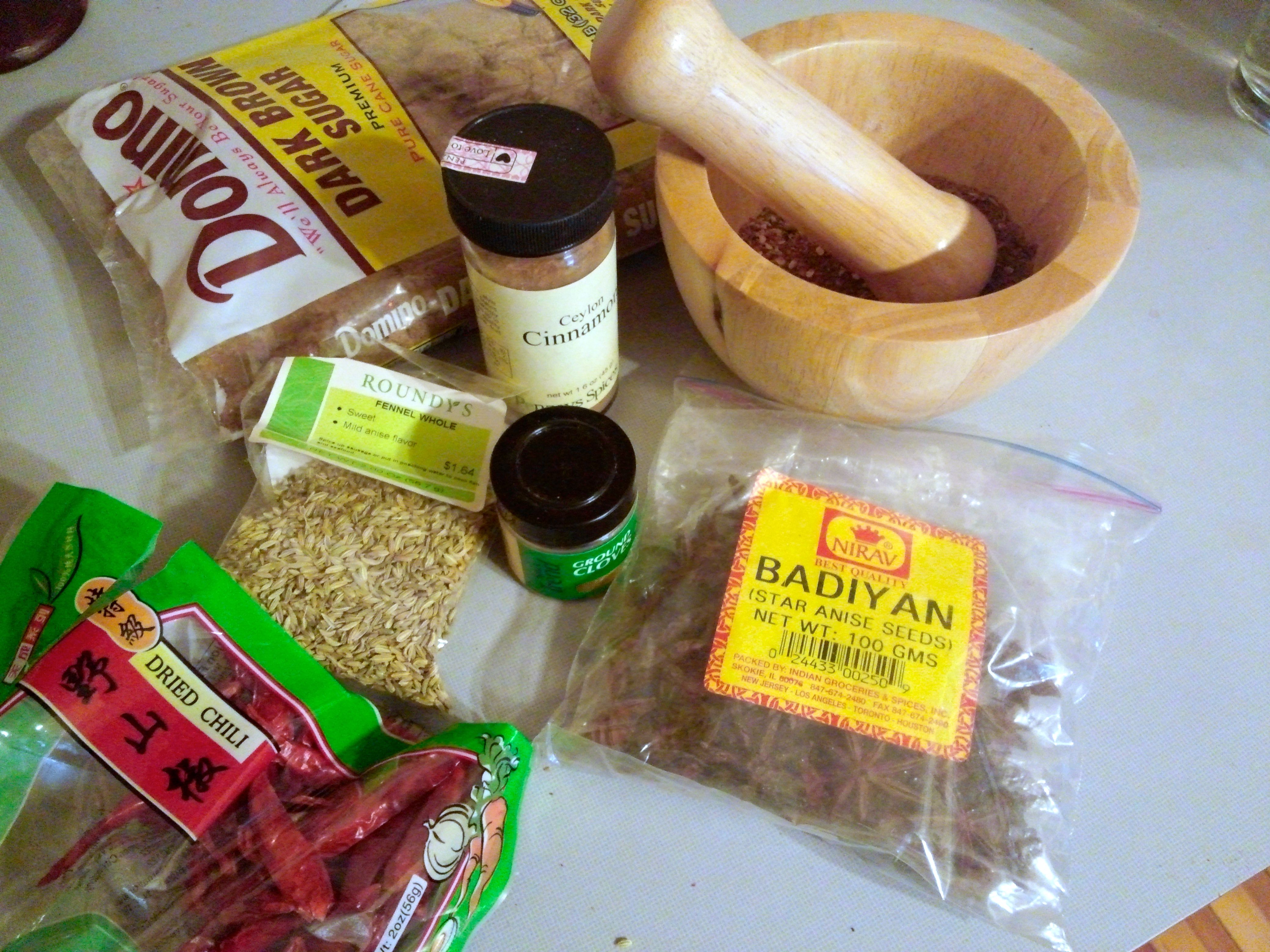 Dressing base ingredients. (Red pepper flakes, Dijon mustard, diluted with apple-cider vinegar, not shown.)