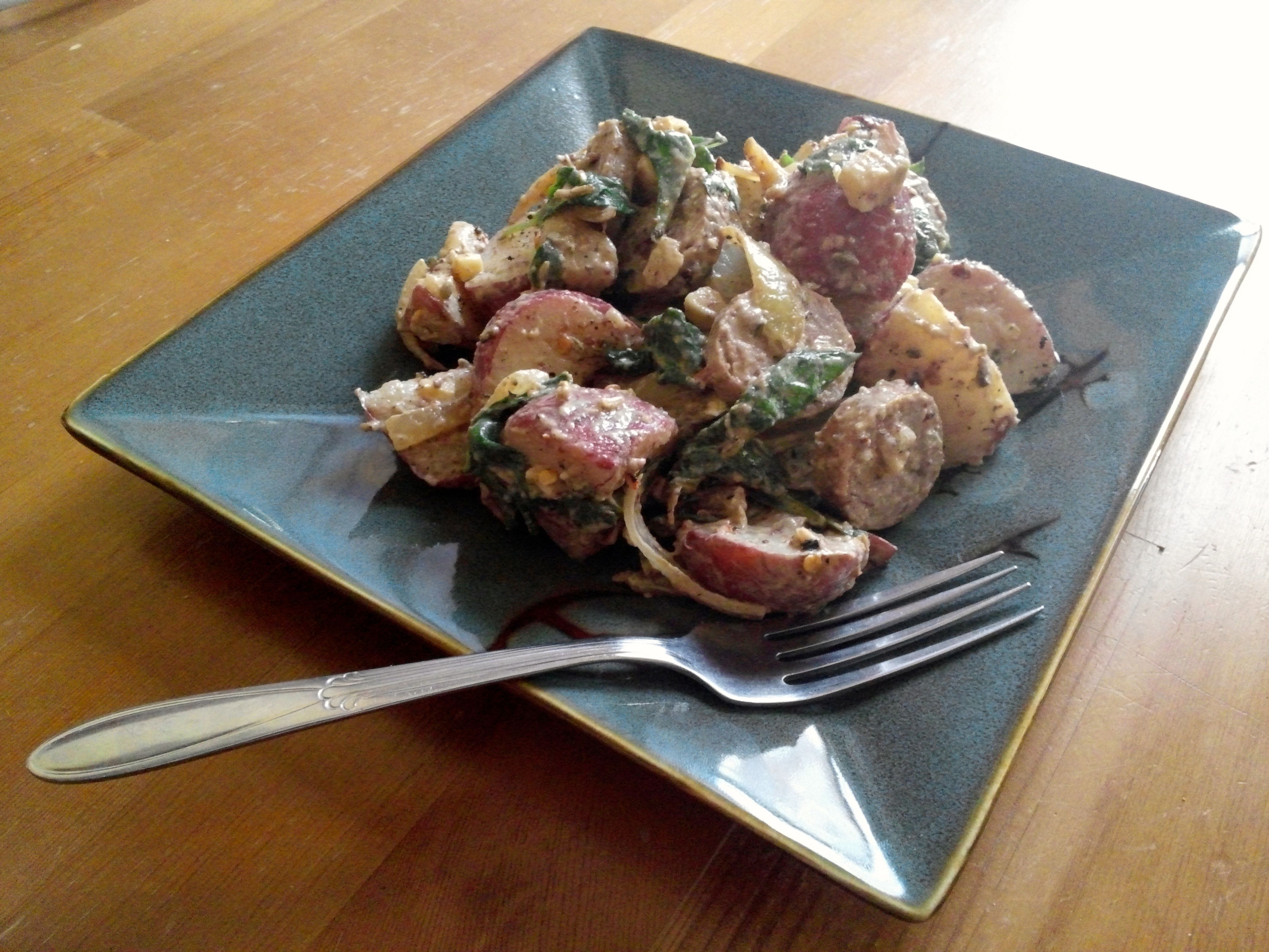 A fellow blogger that I’ve just begun following recently posted a winter potato salad that is different than most potato salads especially in that it contained sliced kielbasa sausage. While I’m happy to eat vegetarian dishes, this struck me as particularly satisfying to serve as a meal, so I considered what ingredients I had on hand and came up with this idea: potato and Italian sausage salad. My version is similarly of the season in that today is a cold, snowy New England day… the sort that dissuades you from running to the market for just the right ingredients.