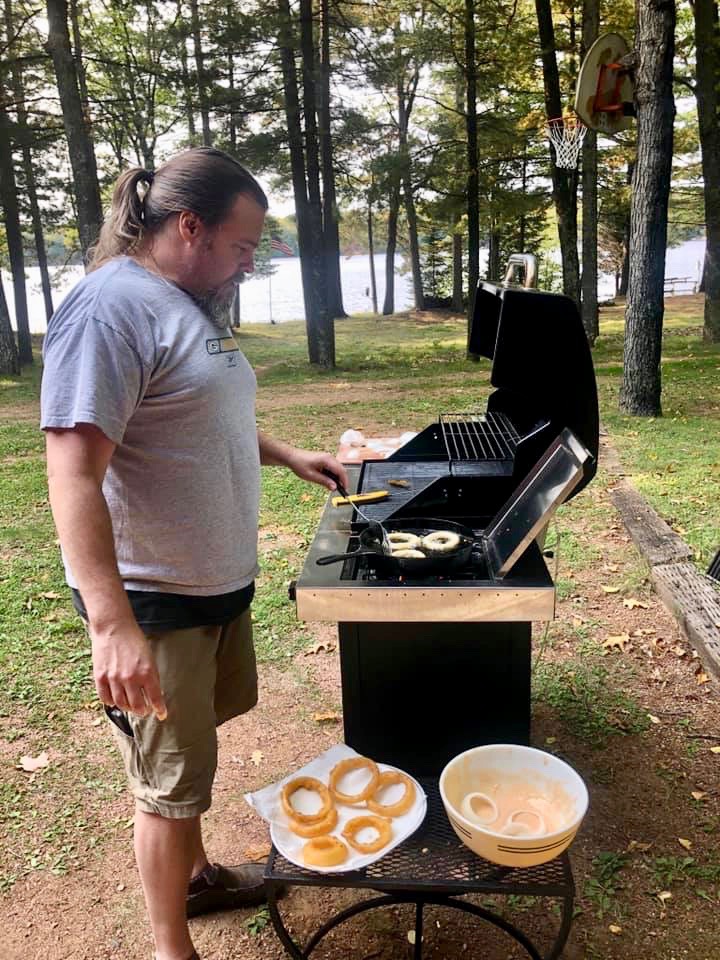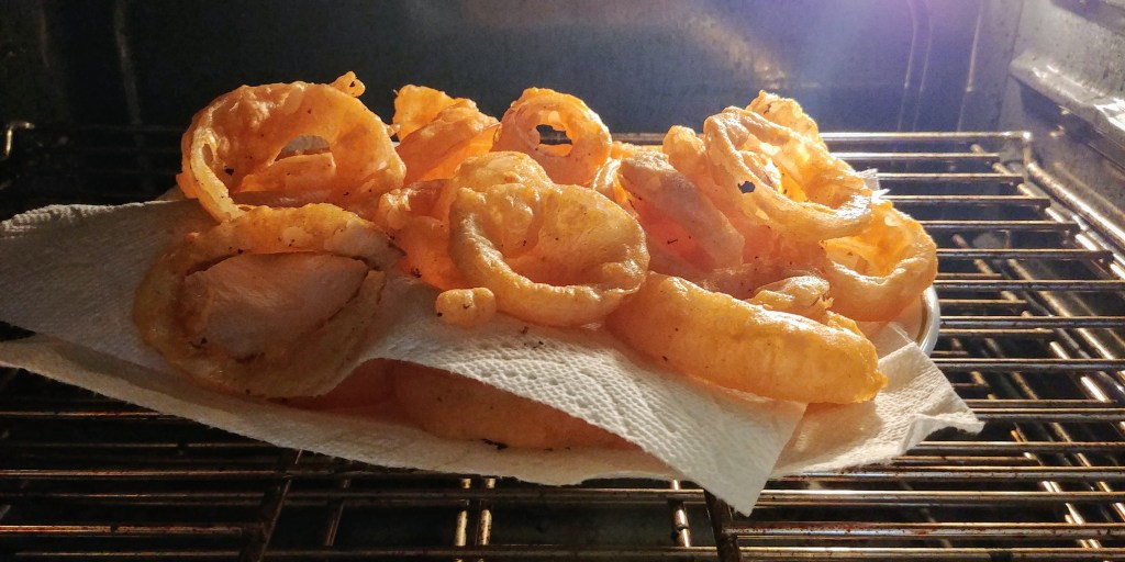 Since both the battering and deep-frying can be a messy process, I prepared these in cast iron pan on a gas grill burner with canola oil at ~375°F, and kept batches warm in the oven until finished.