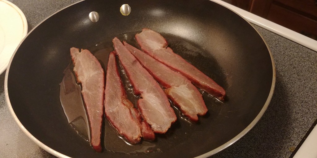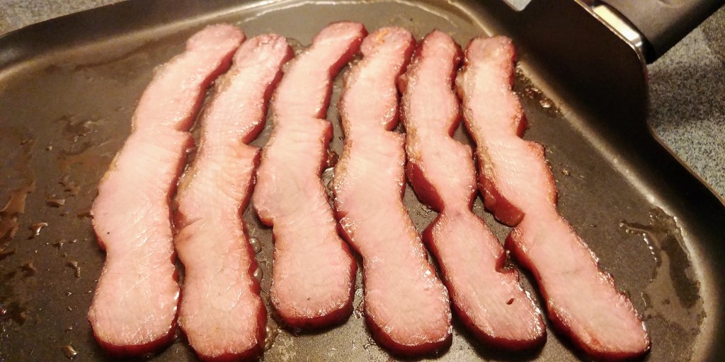 I also suggest pan-frying these strips in about 1/8″ of water since they are much leaner than belly bacon and also because, if you fully-cook the backboard bacon when smoking, you don’t want to lose moisture during frying; you just want to render some of the fat.