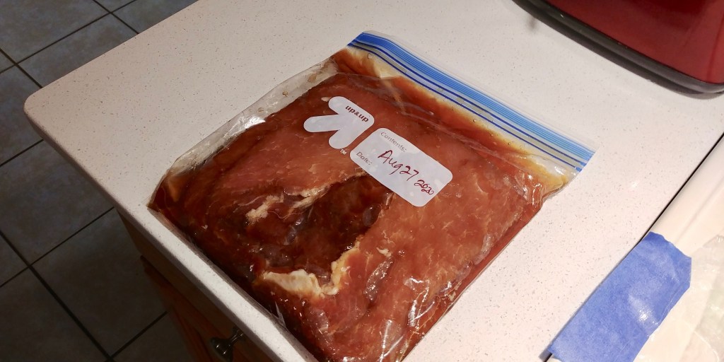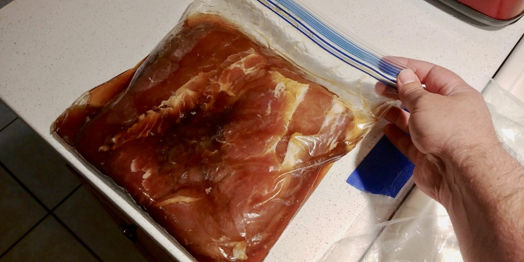 Here, I show a typical process of making nitrite/nitrate-free “uncured” bacon, but modified to result in back bacon strips. I say “uncured” because, although a salt/sugar cure is performed, it is my understanding that the U.S. federal government stipulates this be called “uncured” when not prepared using nitrates (nor possibly even nitrites) for meat preservation. What I show, here, is safe preparation method because (a) the bacon is cured in the refrigerator and (b) the resulting bacon fully cooked. If you’d rather use curing salts, e.g., carefully measured Prague powder #1, go for it! If you do, consult some other recipe or instructions since nitrite/nitrate curing salts are poisonous if accidentally used in excess.