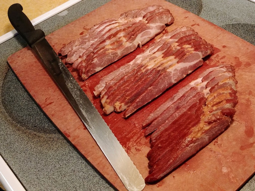 Once refrigerated and firm, it’s time to slice your bacon to desired thickness.