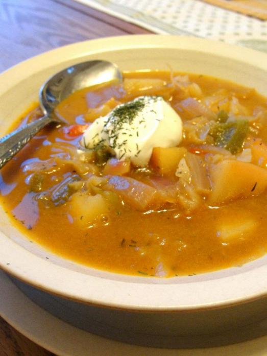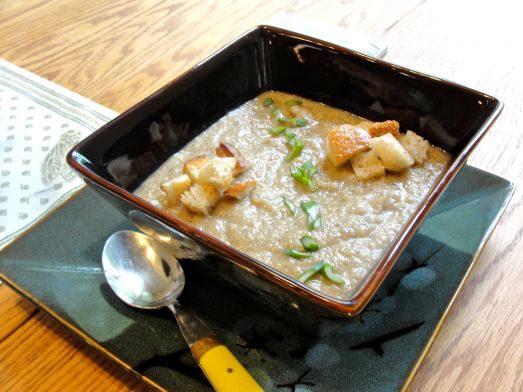 I served the soup topped with sourdough croutons, simply cubed fresh sourdough bread, pan fried in a little salted butter, and some finely sliced green onion, that was luckily growing out the top of one of my yellow onions that had been left in the sunlight on the countertop for too long. :-)