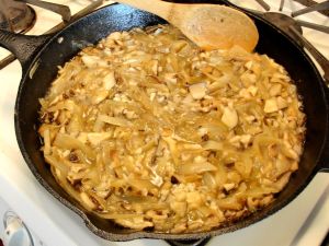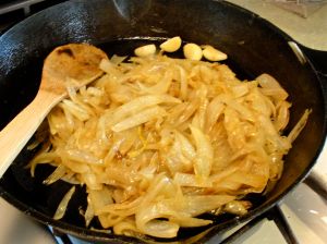 Simultaneously, carmelize the sliced onion with 2 T. olive oil in a large pan or pot (8+ cup capacity; I used a 12-inch cast iron skillet) over low to medium-low heat, strirring often, for 45 minutes to an hour. Be careful not to burn the onions, but rather make them tender and browned slowly, adding a bit more olive oil if it seems they are drying out.