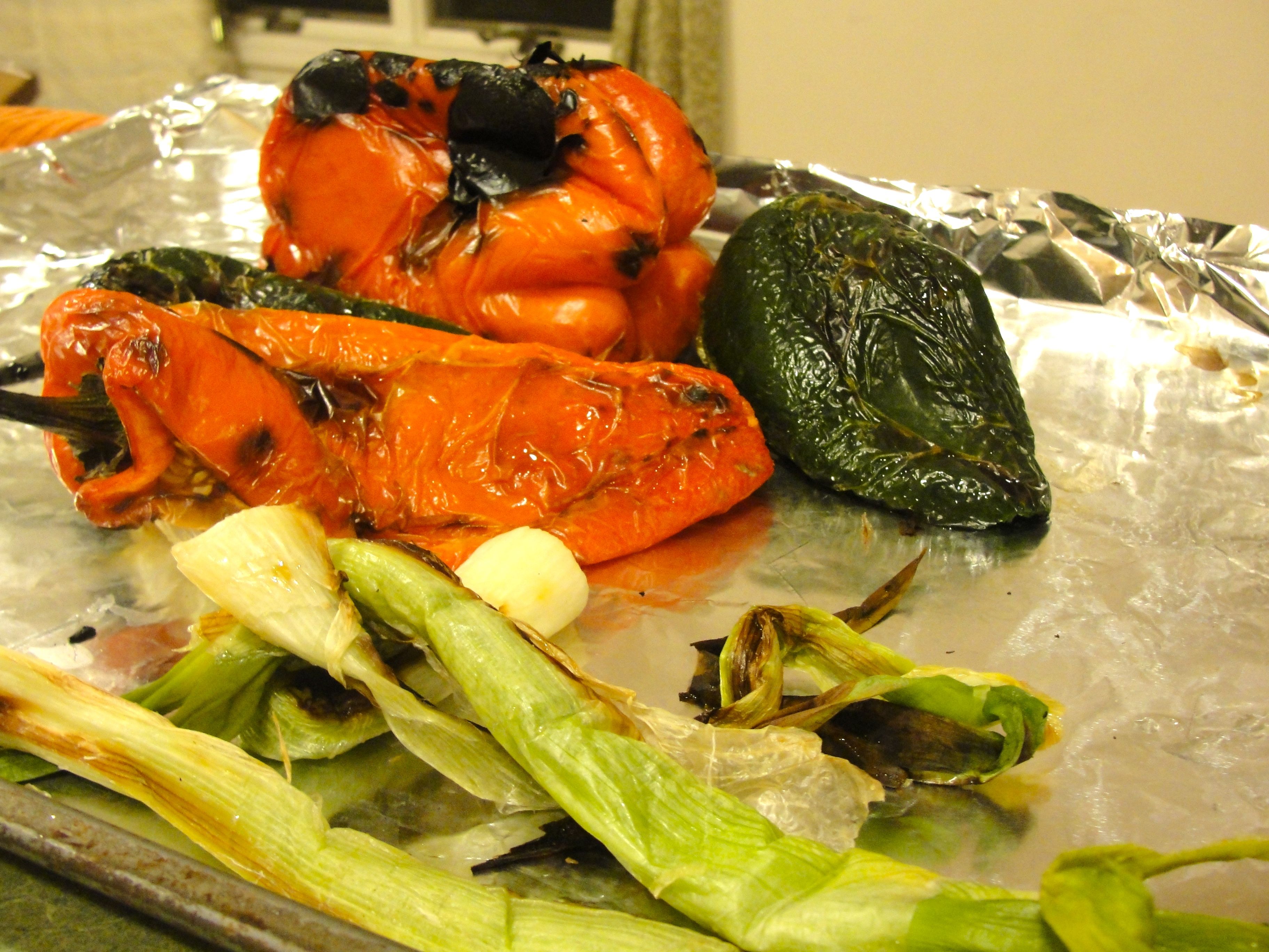 When carmelized sufficently, the onions should be moist, browned, and very tender; the garlic cloves should be tender as well. (I removed the garlic from the foil to accelerate the roasting.)