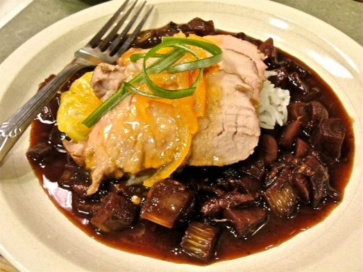 I marinated this pork tendorloin in olive and sesame oils, red pepper flakes, and minced fresh garlic and ginger and cooked separately. The wine sauce with vegetables was made similarly to that in the recipe below.