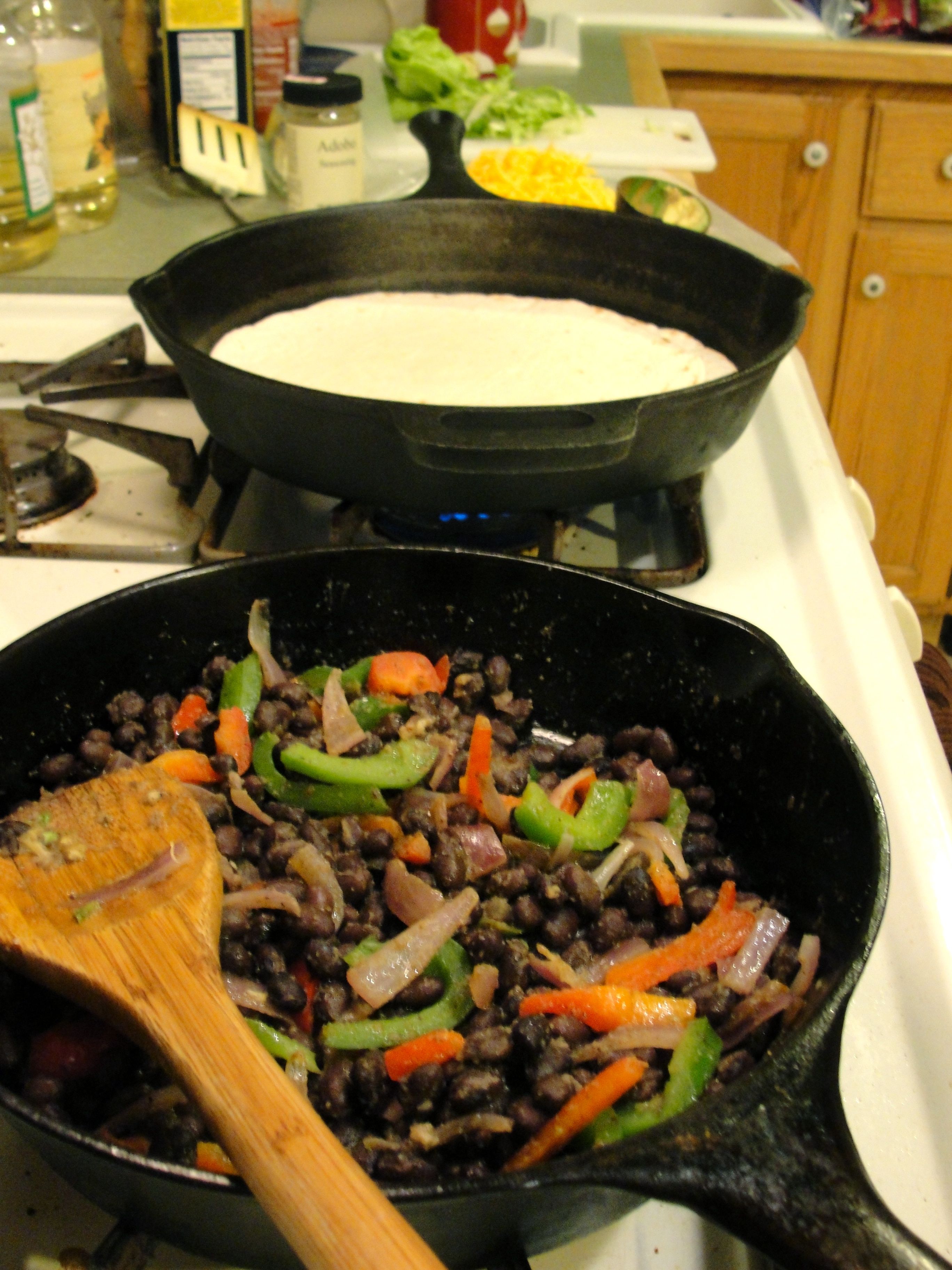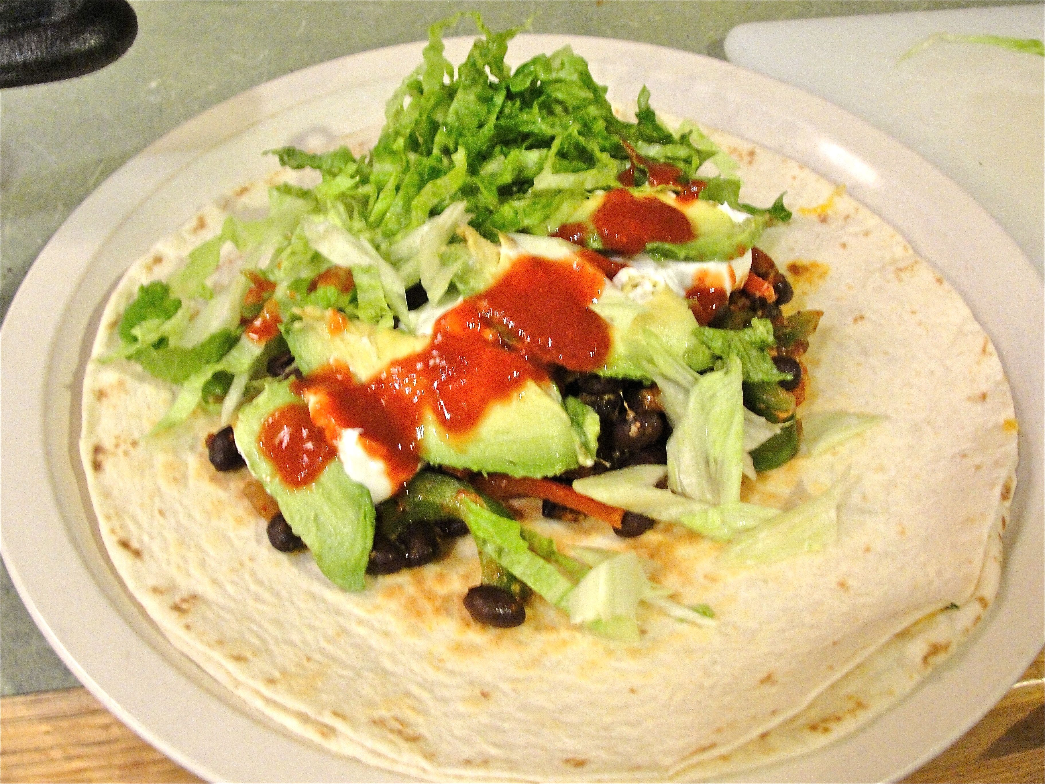 To start, I sautéed green pepper, red pepper, and red onion pieces in a bit of oil. Then I added a can of rinsed black beans, and stirred in a couple teaspoons of adobo seasoning and a touch of salt. The amount shown here is plenty for two burritos.