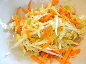 - napa cabbage (3 leaves, green separated from white – see photos below, greens finely sliced/shredded)