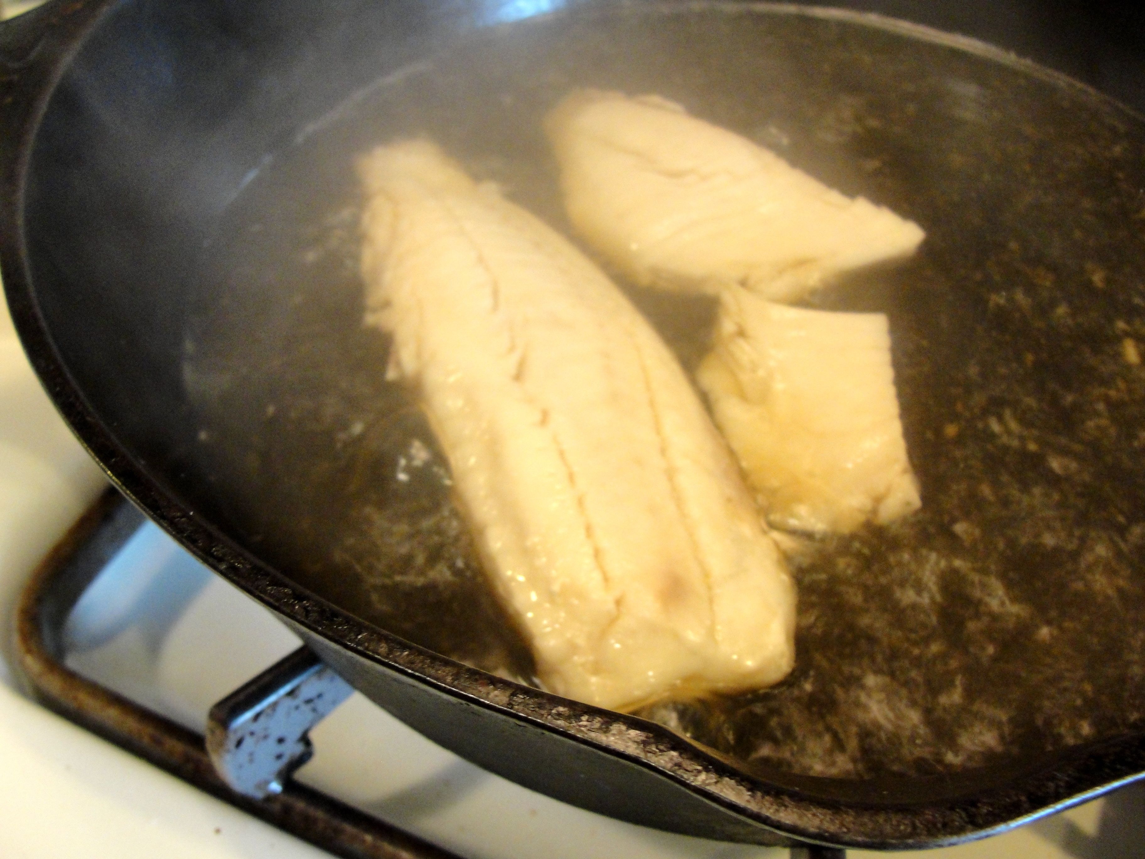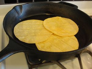 For the fish, I chose a tilapia fillet (from frozen, thawed in water), and poached it in a salmon-and-vegetable-based fish stock along with a couple teaspoons of soy sauce. Here, I had just separated some pieces to test for doneness (i.e., if it will flake apart.) Concurrently, I warmed corn tortillas in a skillet, and then wrapped them in a towel; this keeps them from getting wet underneath, e.g., if set on a plate when they’re very warm.