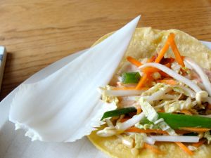 These tacos were easy and delicious. They’d probably be nice with mu shu pancakes or flour tortillas as well.