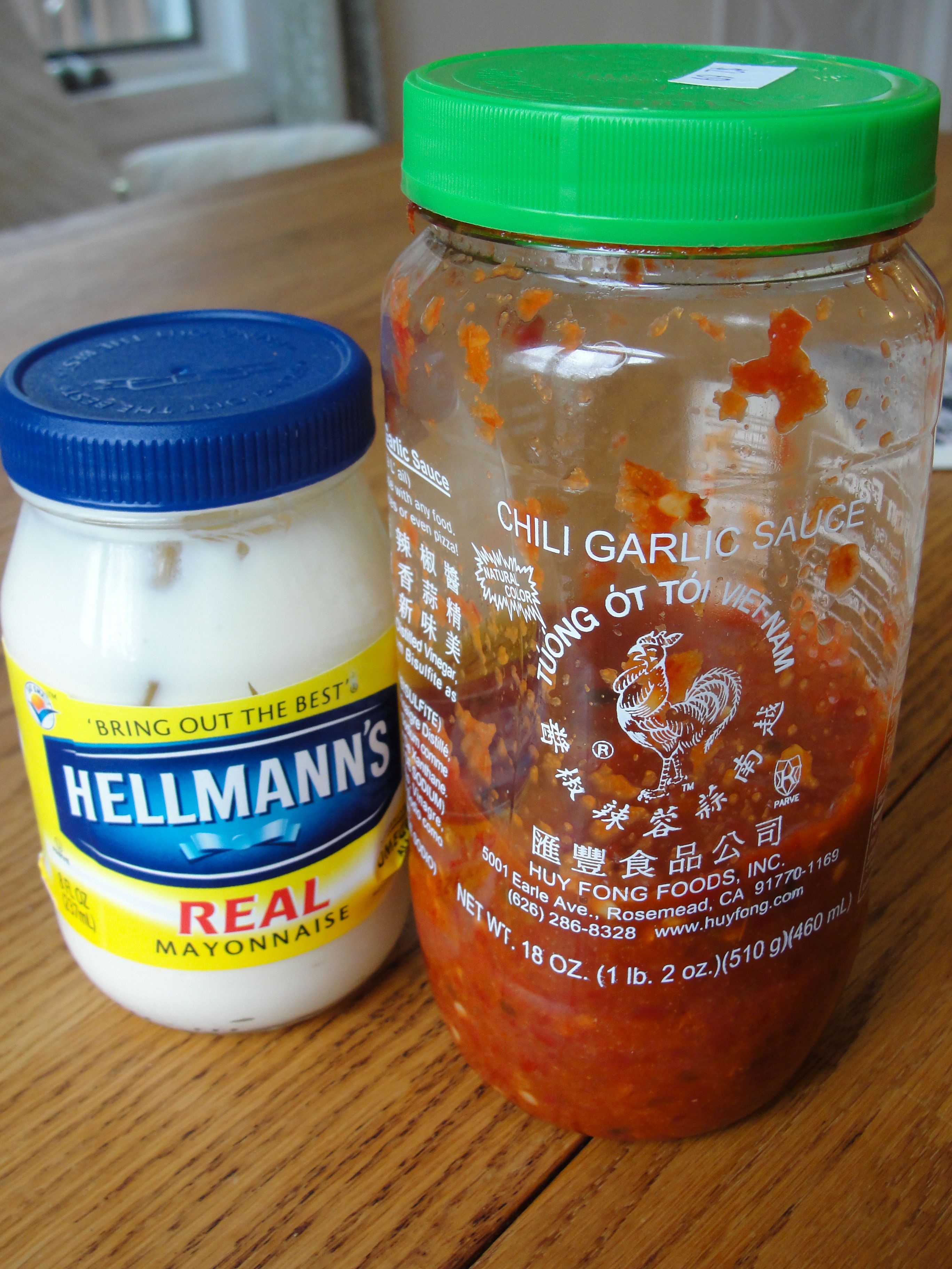 For the sauce, simply mix equal parts of mayonnaise and chili garlic sauce.